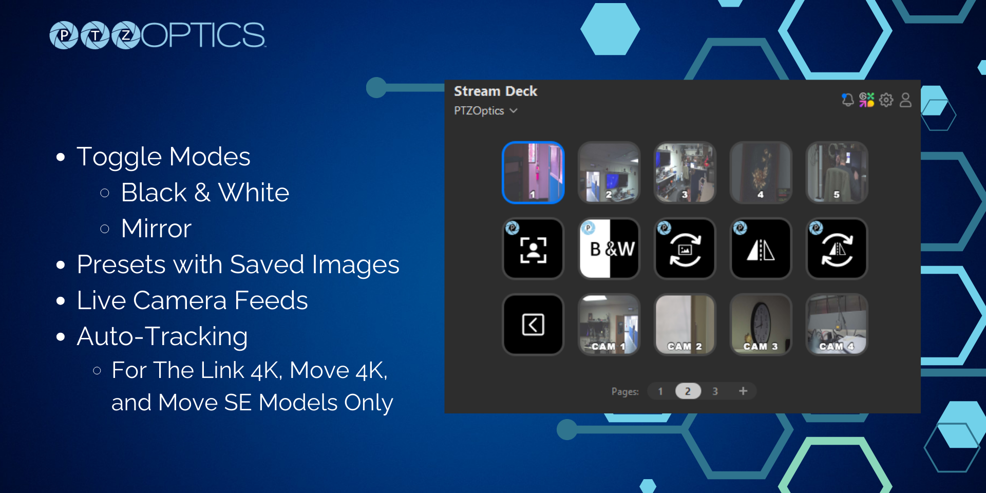 The PTZOptics StreamDeck Plugin supports StreamDeck Mini, StreamDeck MK.2, StreamDeck XL, and StreamDeck Pedal hardware. It is currently compatible with Move SE, Move 4K, Link 4K, and Gen 2 PTZ cameras.
